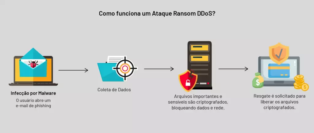 O ataque pode ter começado de várias maneiras – pode ter havido uma contaminação por phishing (nesse caso, um malware recebido em e-mail, por exemplo) ou uma intrusão na rede por meio de uma vulnerabilidade em algum dos dispositivos ligados a ela. Mas existe um ataque com extorsão, em que o cibercriminoso também exige resgate, e no qual nada disso é necessário: ele não precisa de malware algum para suas ações, podendo atacar à distância com o RDDoS – ou Ransom DDoS, um ataque de negação de serviço com exigência do pagamento de um resgate, que é enviada por eMail. As empresas que não estiverem protegidas por um bom serviço de mitigação de tráfego malicioso podem se considerar em risco.