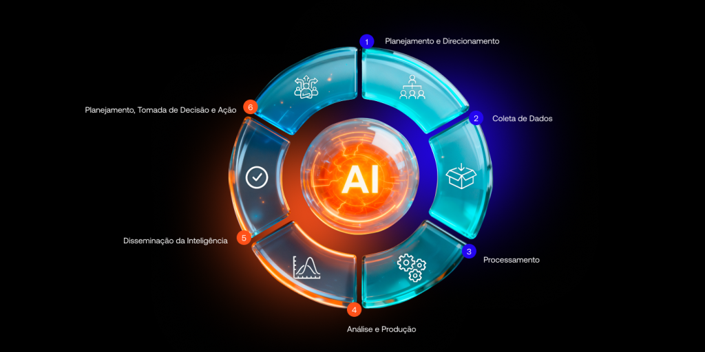 Na sequência, ocorre a análise, onde especialistas e ferramentas de Inteligência Artificial transformam os dados em conhecimento útil. Por fim, as informações são disseminadas para os responsáveis pela segurança e há um ciclo de feedback para aprimorar os processos.